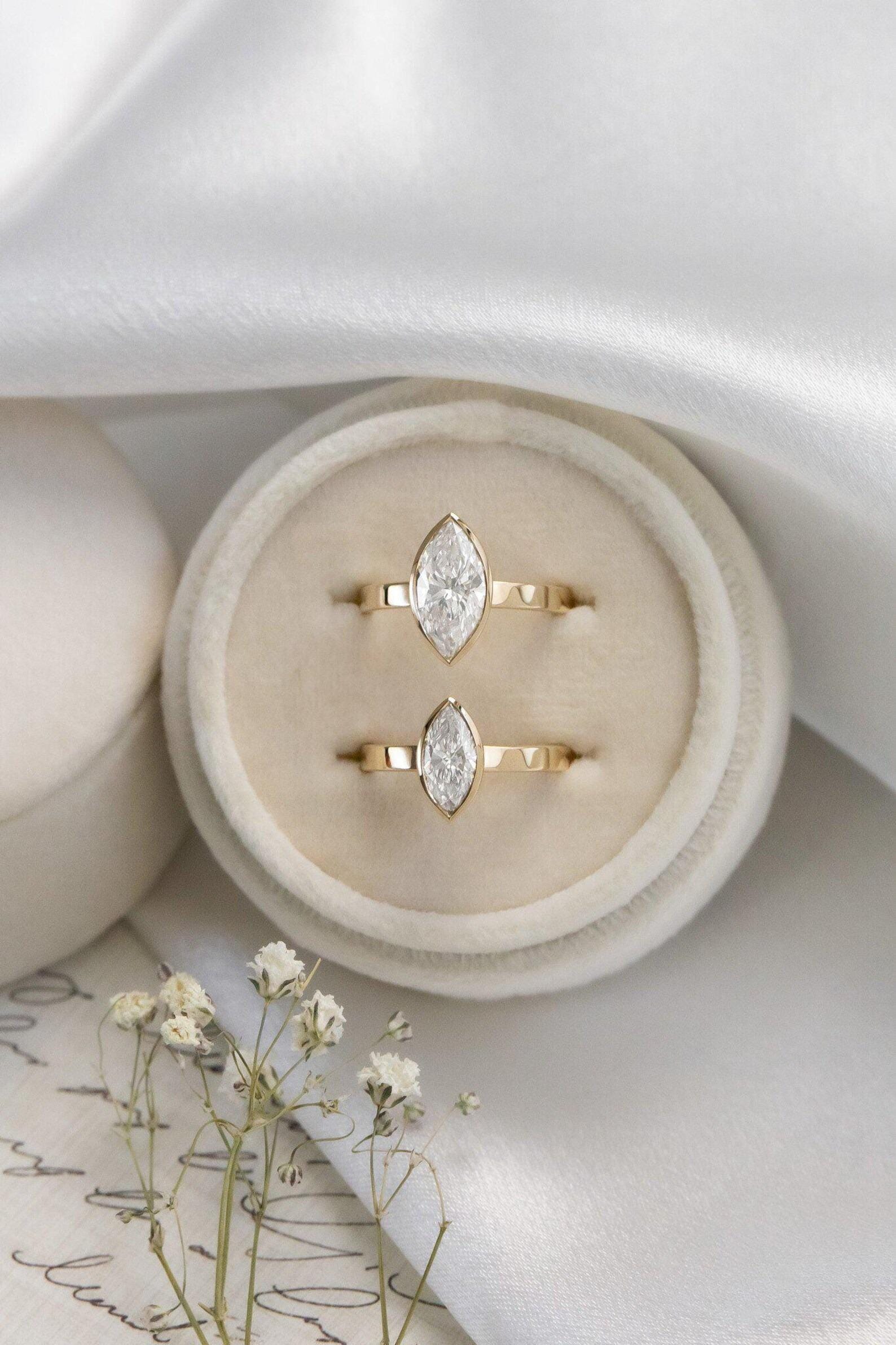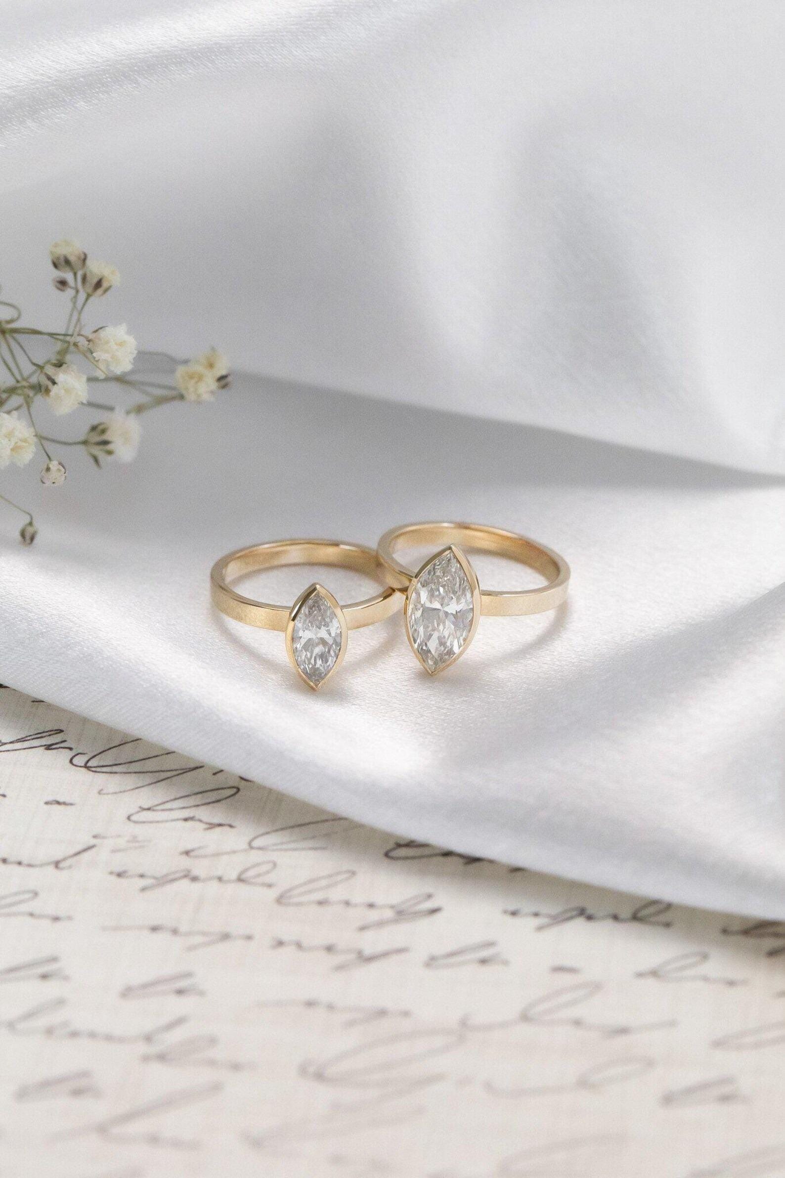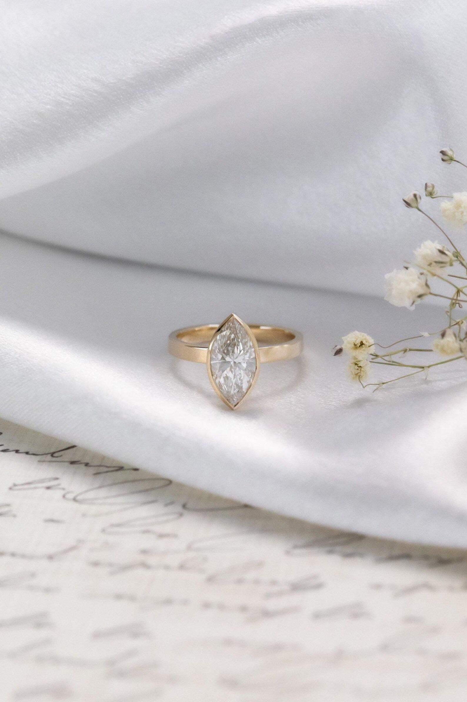 Marquise Cut Moissanite Engagement Ring | Thick Band Bezel Set Diamond Solitaire Ring | Plain Wide Band Gold Proposal Ring, Anniversary Gift