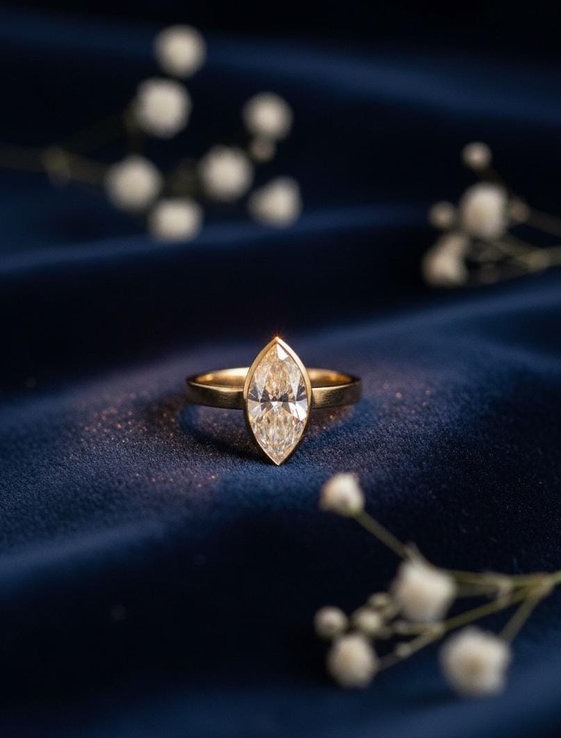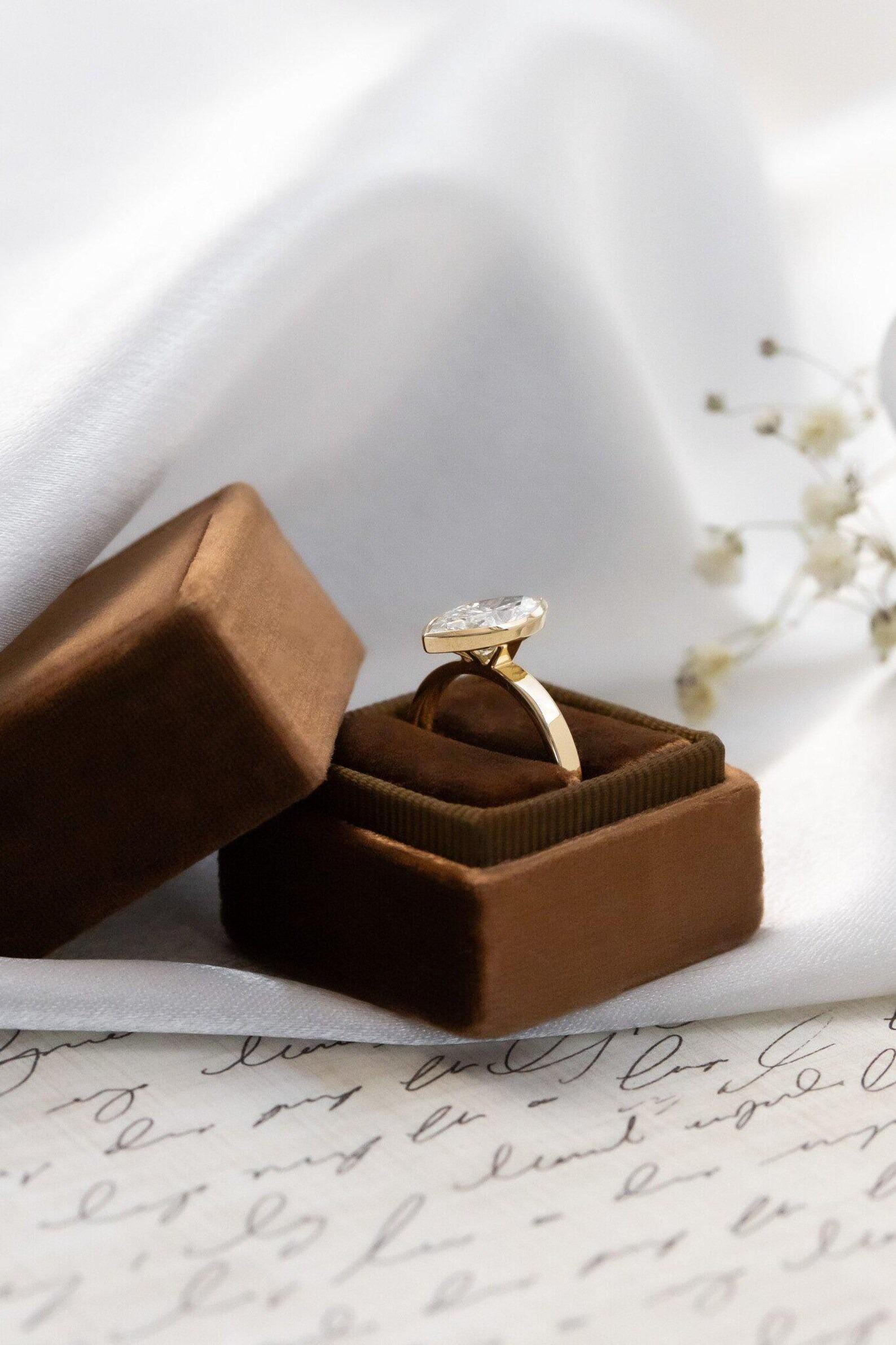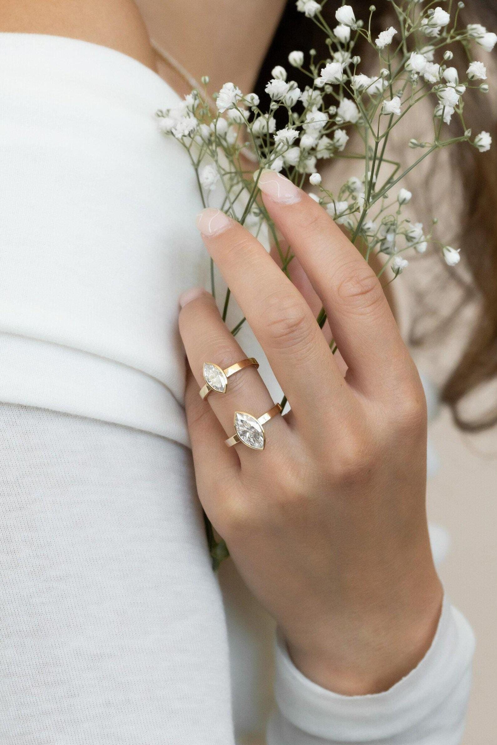 Marquise Cut Moissanite Engagement Ring | Thick Band Bezel Set Diamond Solitaire Ring | Plain Wide Band Gold Proposal Ring, Anniversary Gift