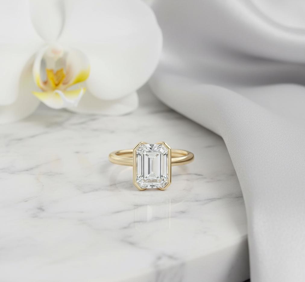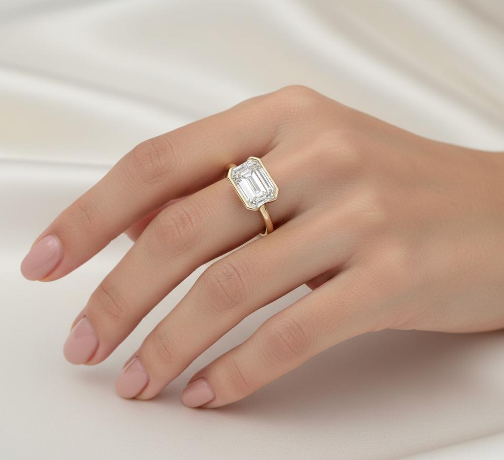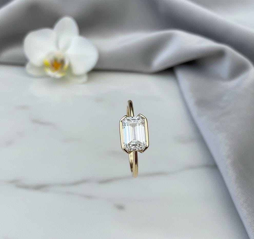 Vintage 2CT Emerald Cut Moissanite Engagement Ring | East West Emerald Cut Moissanite Solitaire Ring | Half Bezel Set Wedding Ring for Women