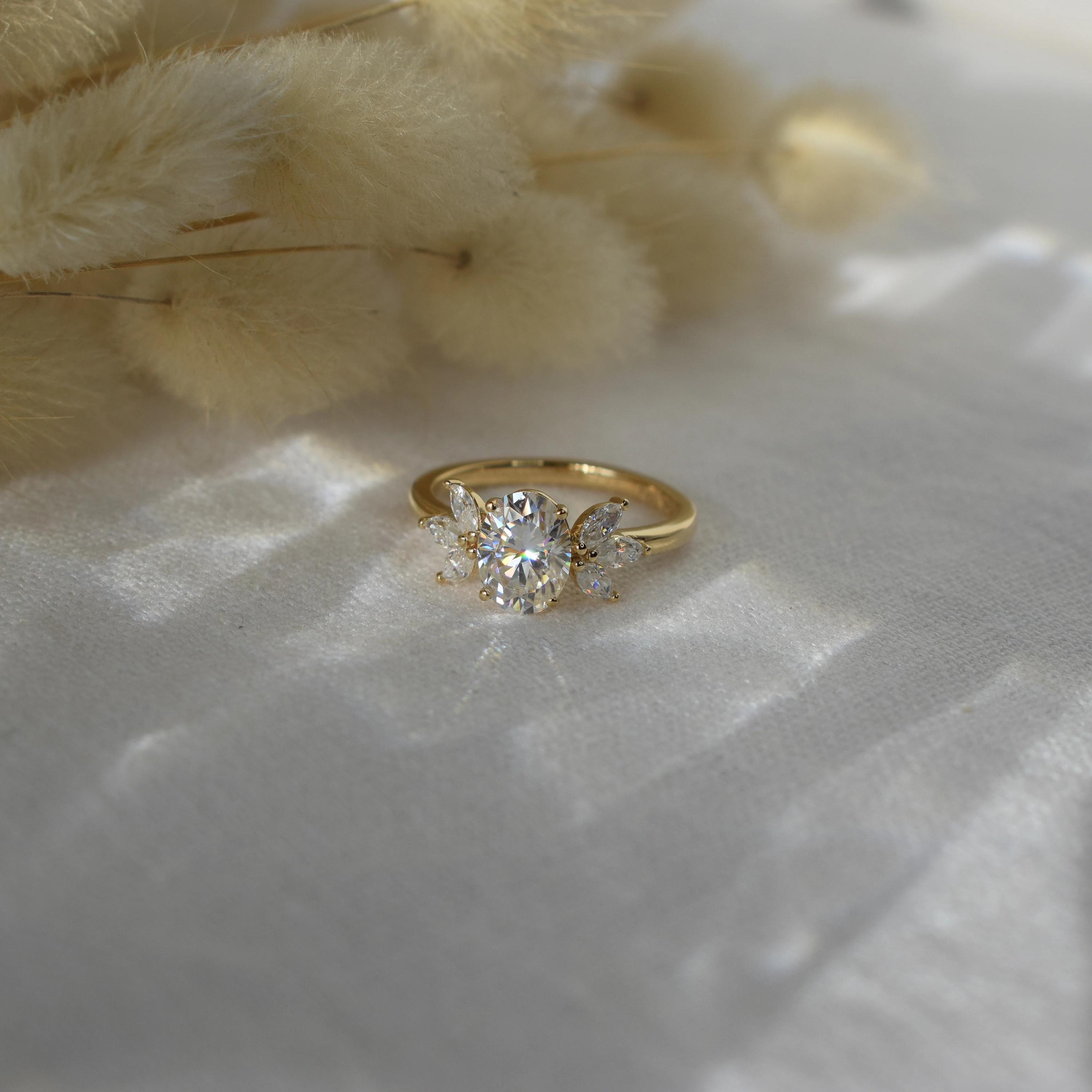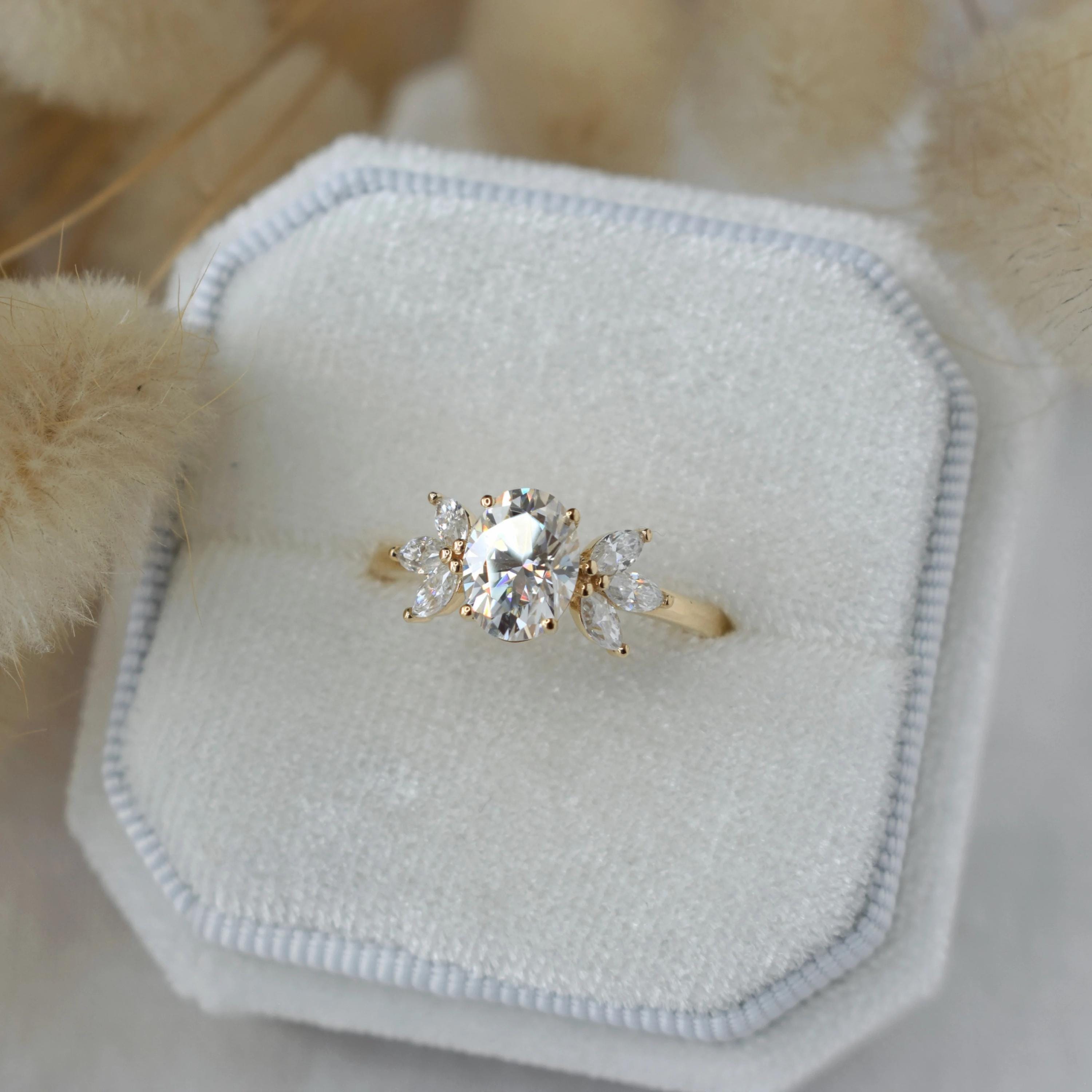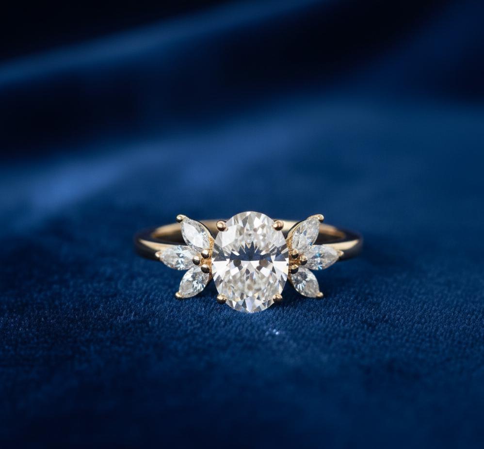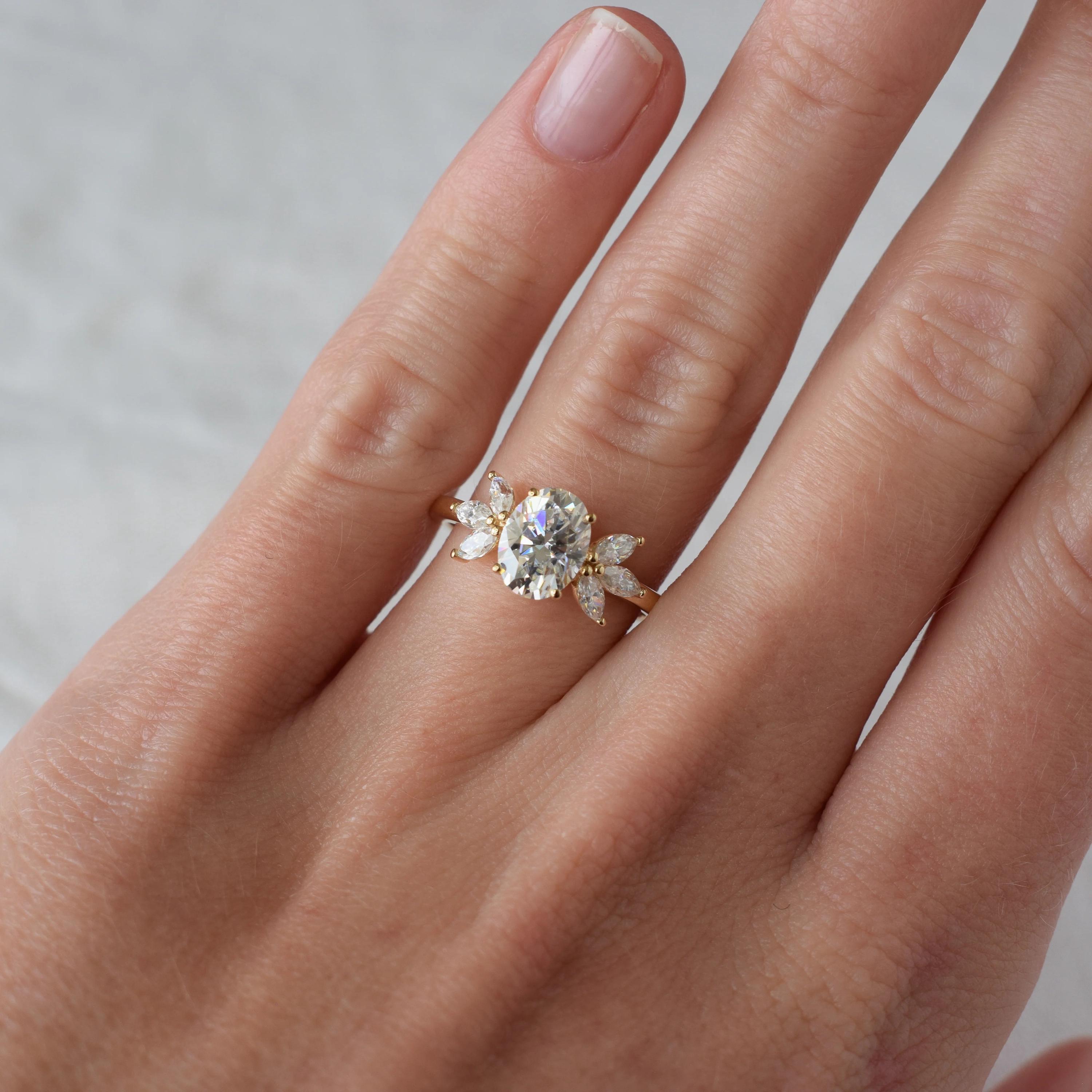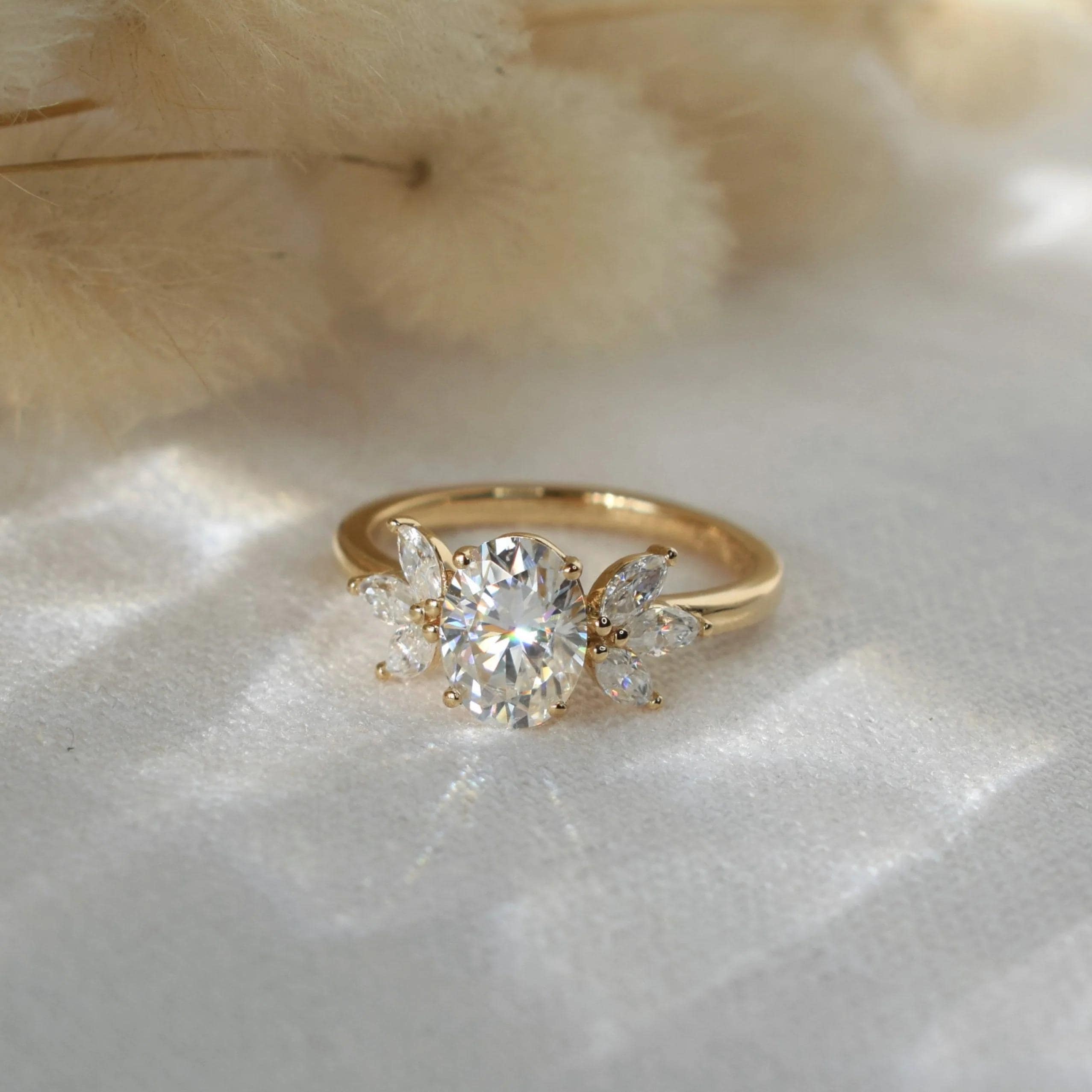 2.5Ct Oval Cut Moissanite Engagement Ring | Vintage Marquise Cluster Ring, Brilliant Moissanite Ring | 9k Solid Gold Plated Leaf Design Ring