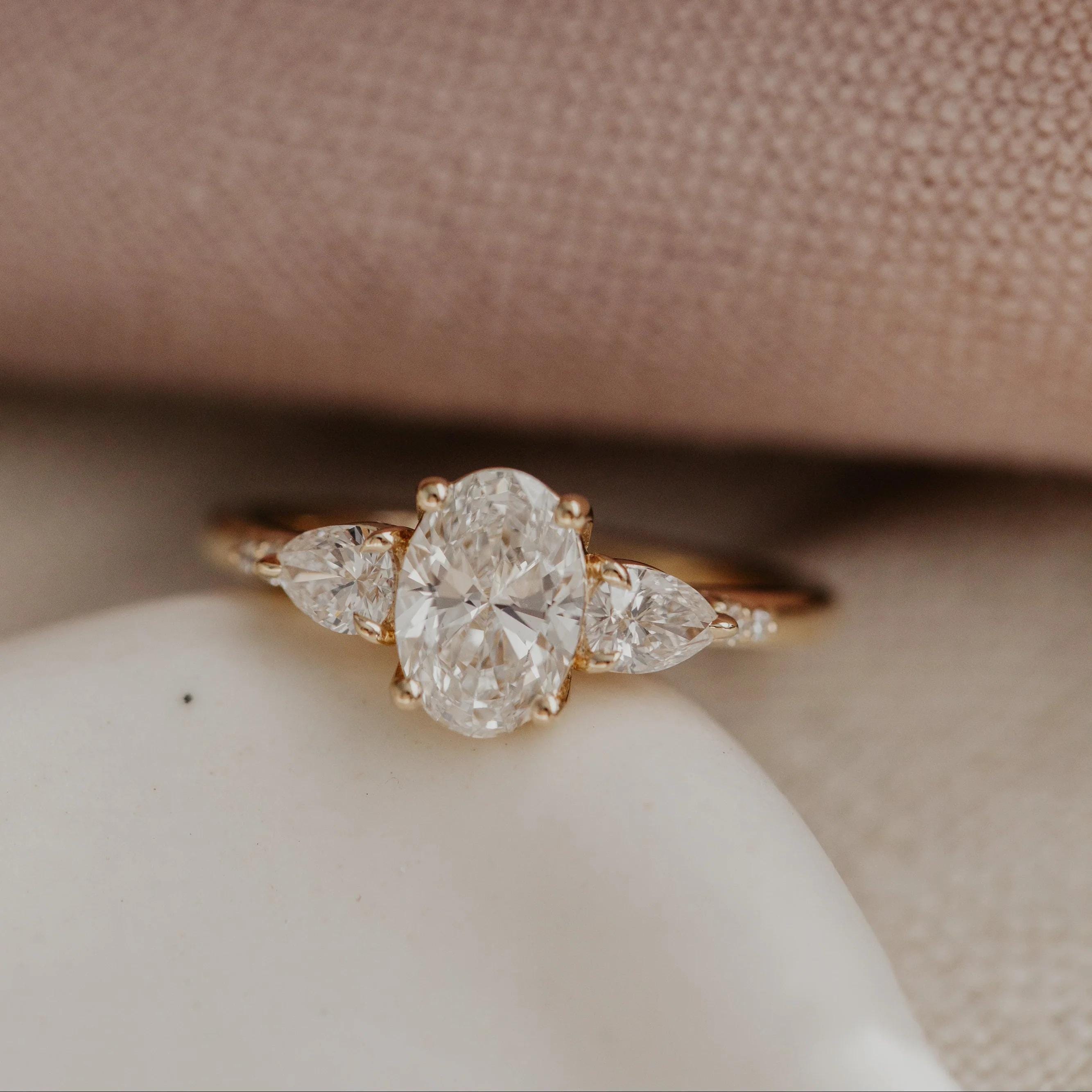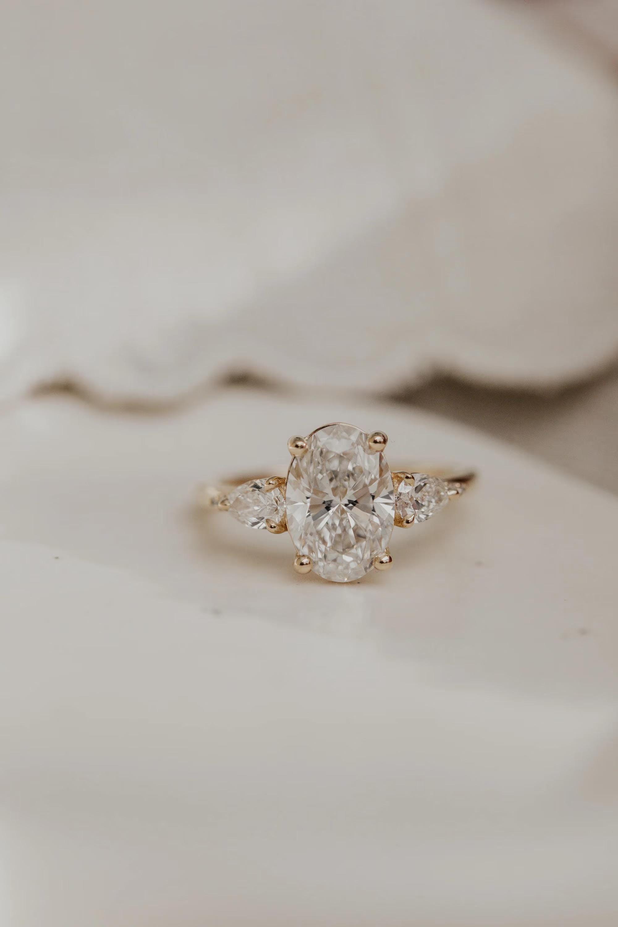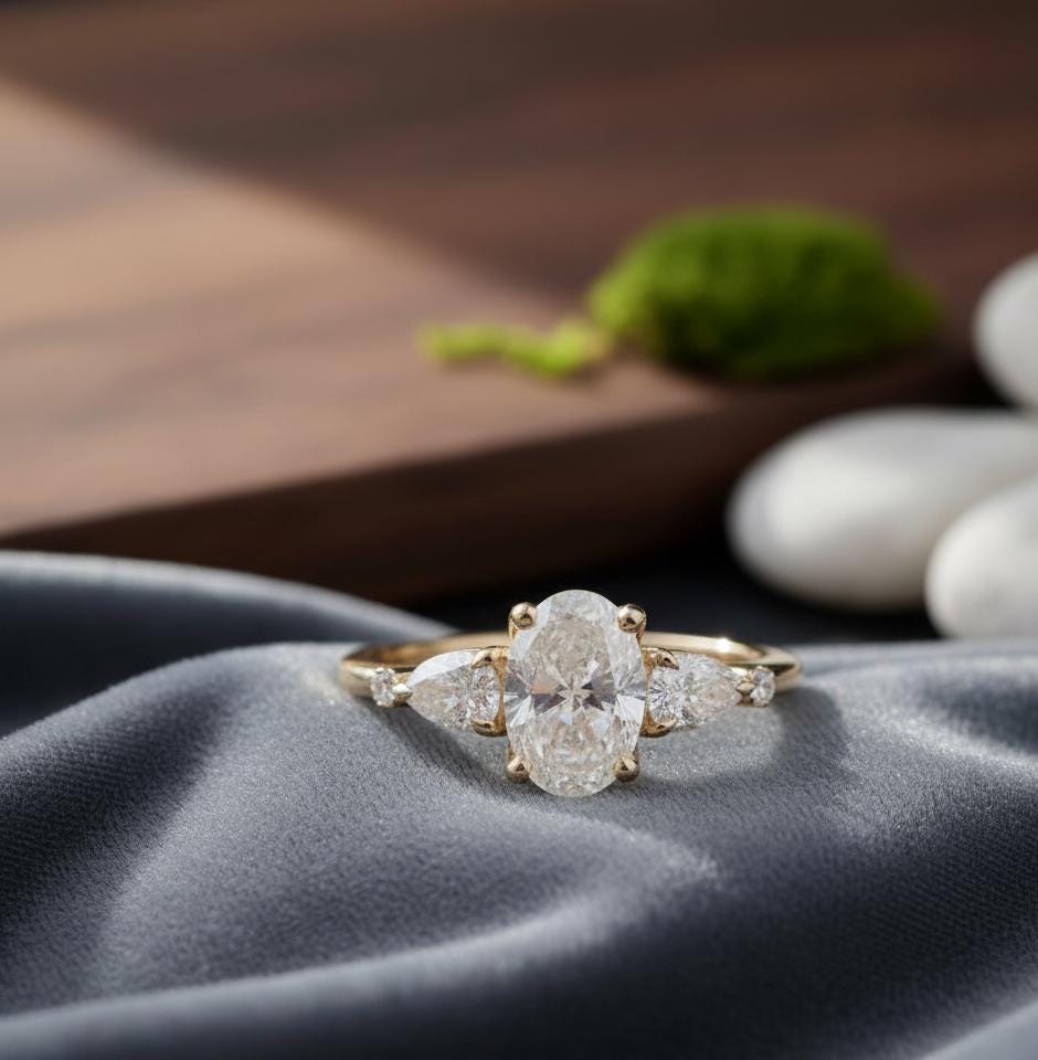💎Main Stone: 3ct Moissanite 💎Main Stone Color: Colorless 💎Main Stone Shape: Oval 💎Main stone creation: Lab-created 💎Secondary Stone: 0.50ct Each CZ Diamond 💎Stone Shaped: Pear & Round(0.05ct) 💎Stone Color: Colorless