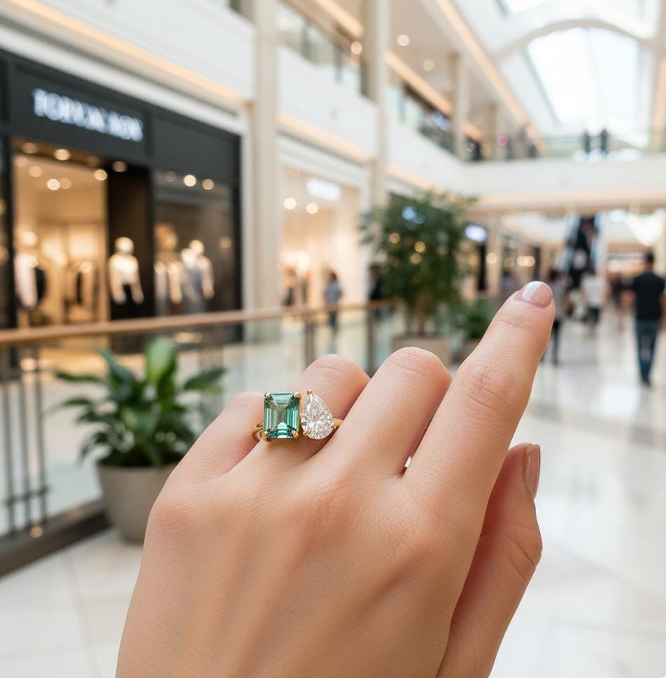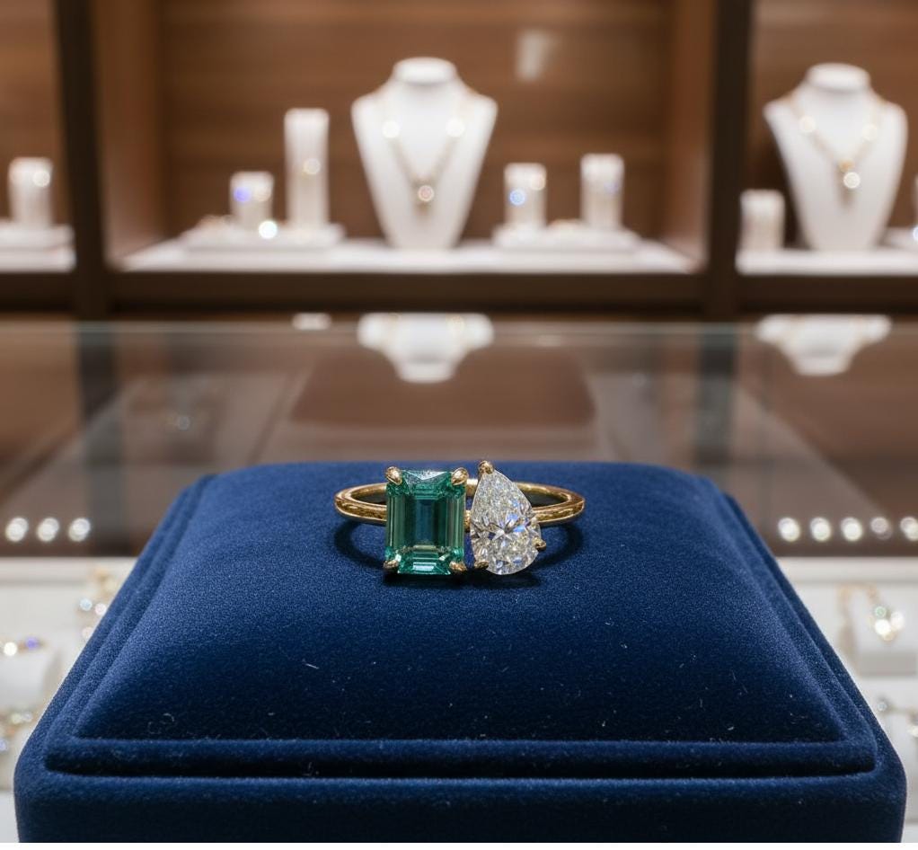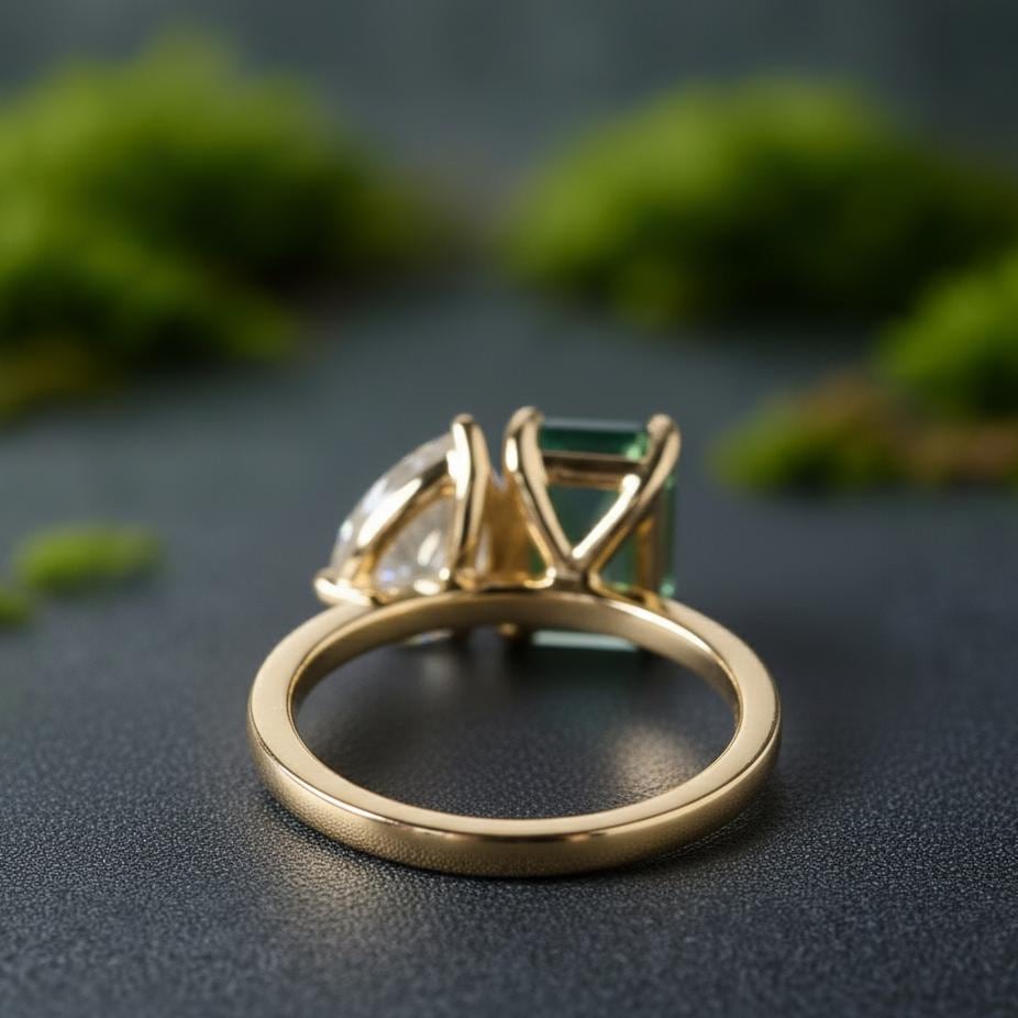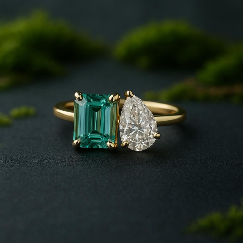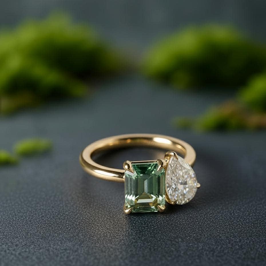 💎Main Stone: Tourmaline 💎Main Stone Color: Green 💎Main Stone Shape: Emerald 💎Main stone creation: Lab-created 💎Secondary Stone: Moissanite 💎Stone Shaped: Pear 💎Stone Color: Colorless