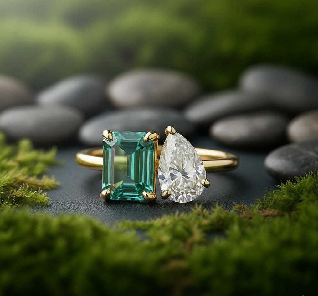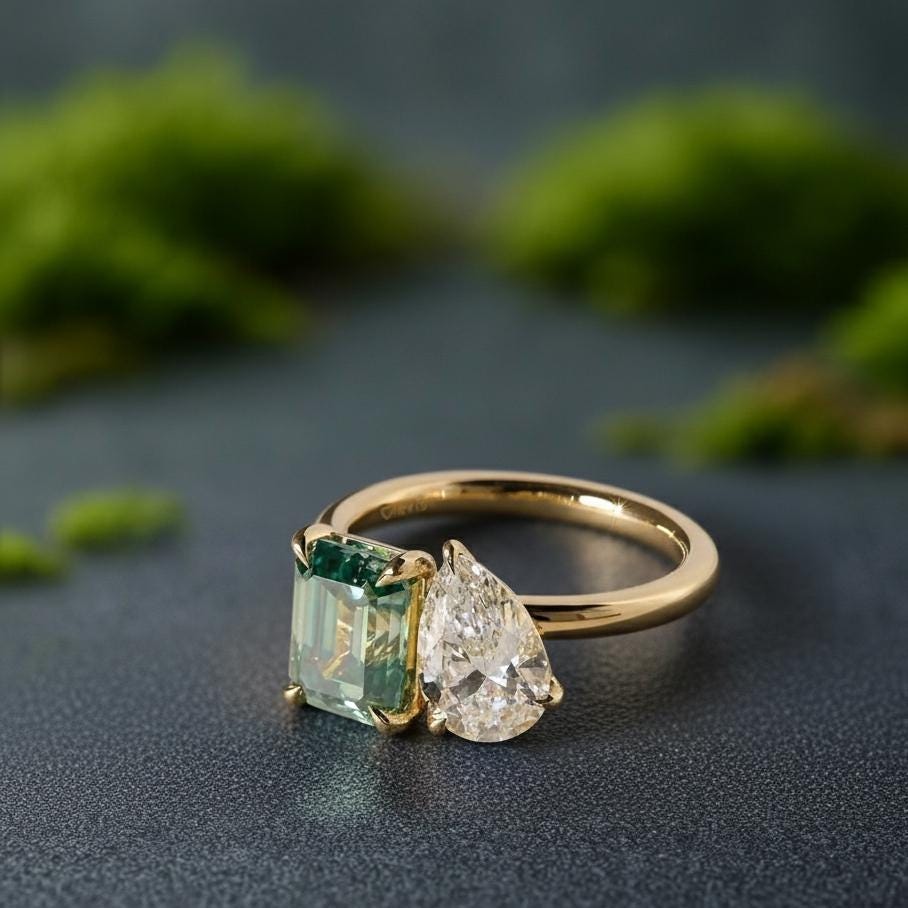 Vintage Toi Et Moi Engagement Ring | Tourmaline & Pear Moissanite 14k Gold Promise Ring | Engagement Ring | Two Stone Mother Daughter Ring