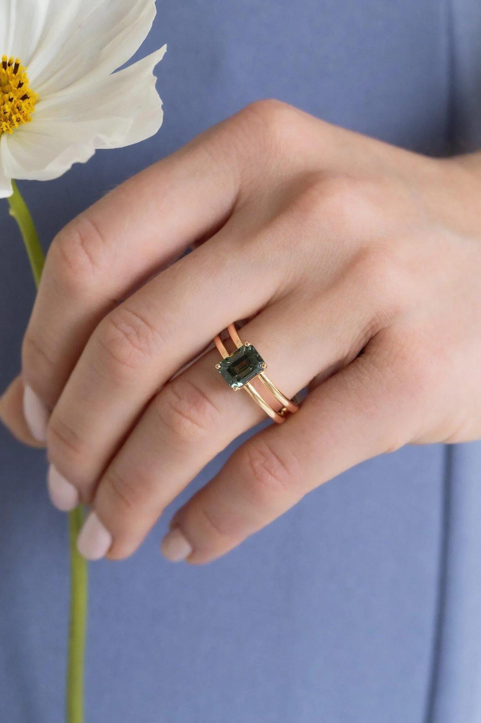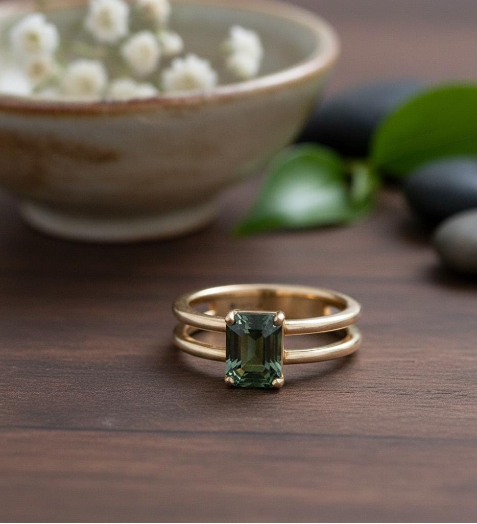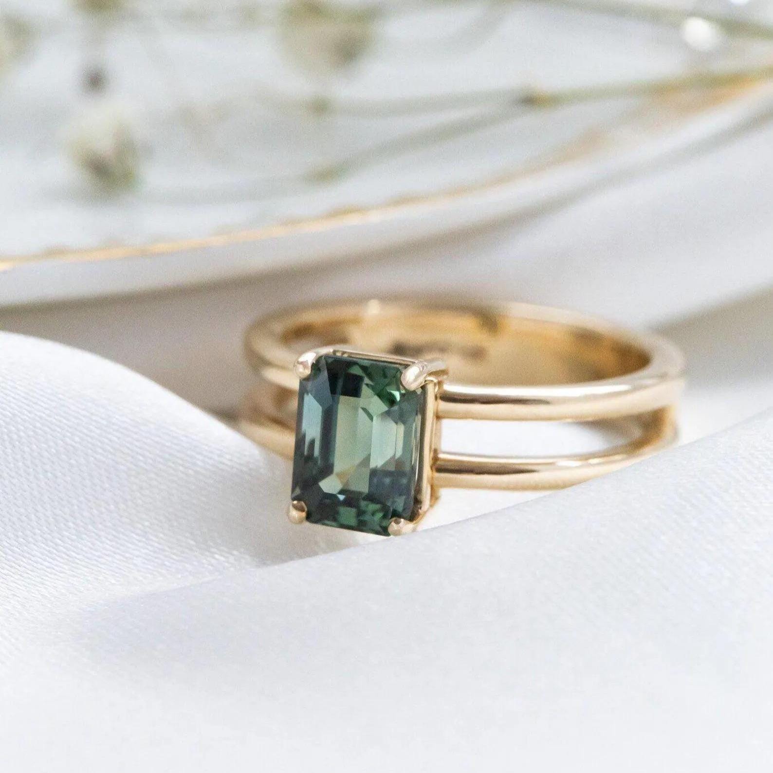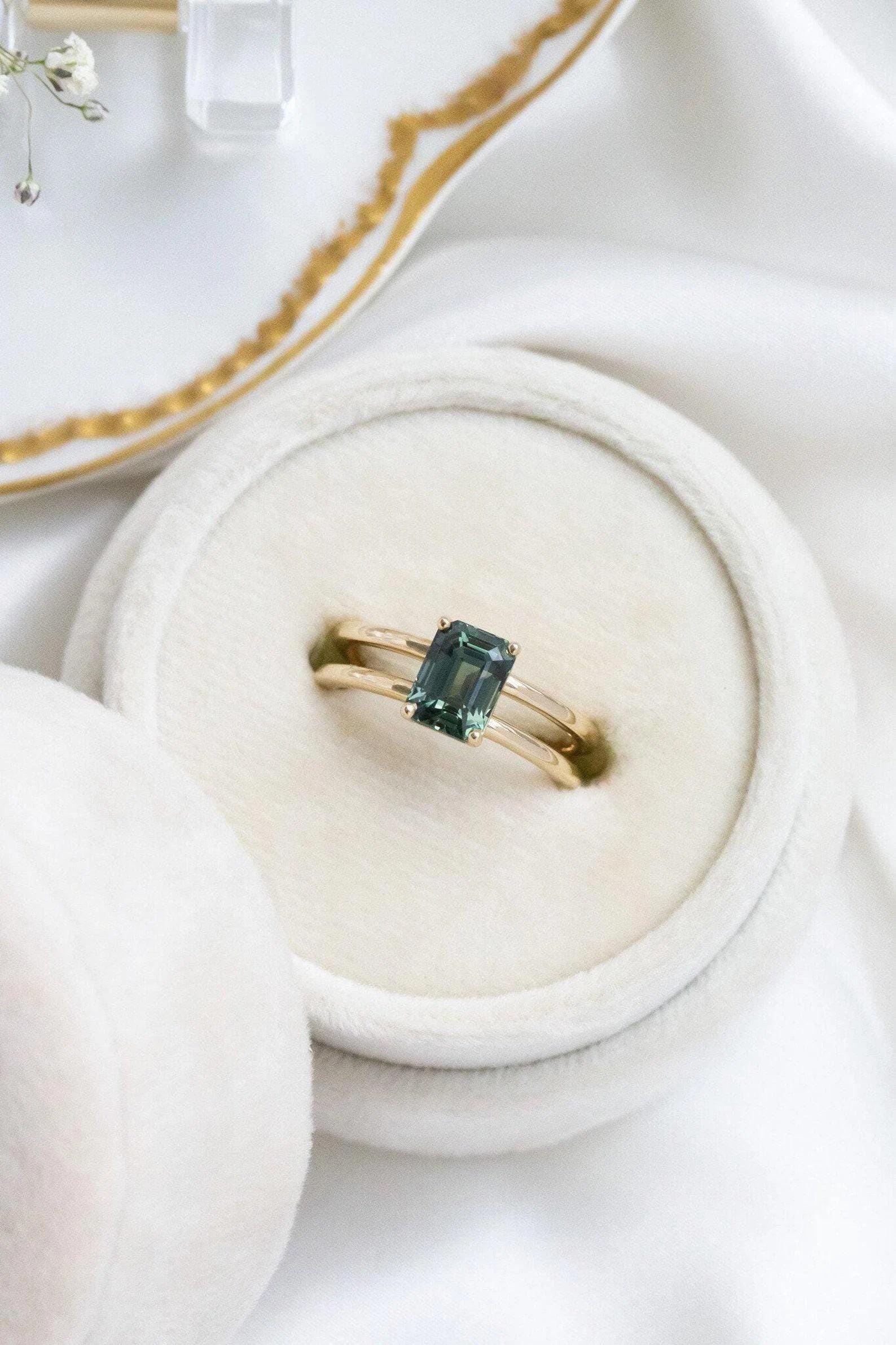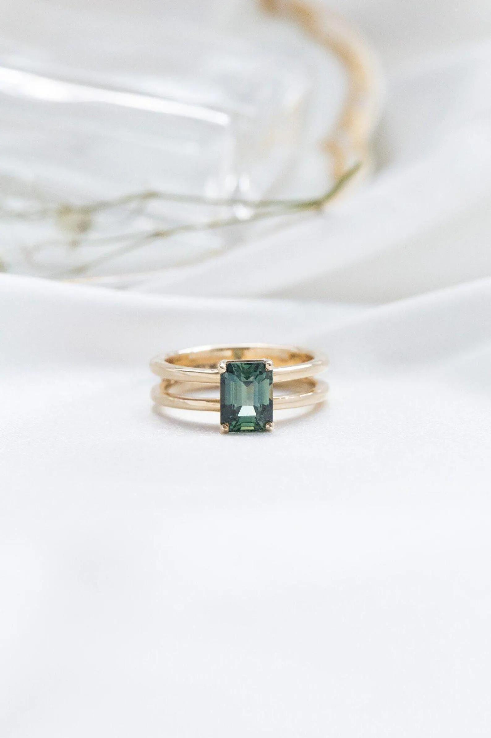 💎Main Stone: Sapphire 💎Main Stone Color: Greenish Blue 💎Main Stone Shape: Emerald 💎Main stone creation: Lab-created